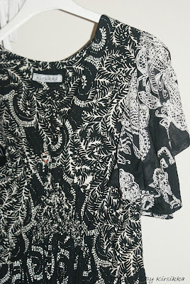 Mekkokangas on Balilta, ystävän tuoma.Käytin mekossa kolmea erilaista mustavalkoista kangasta.Ekaks ajattelin ihan hihatonta mekkoa, mutta päädyinkin perhoshihoihih.Nehän saa tarvittaessa purettua, jos ei tunnu hyvältä....